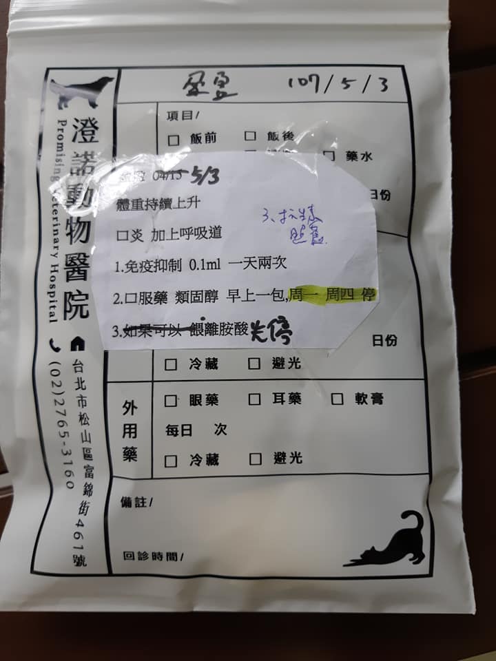 類固醇:周一跟周四停用《早》一次,每次一包,混嬰兒泥。