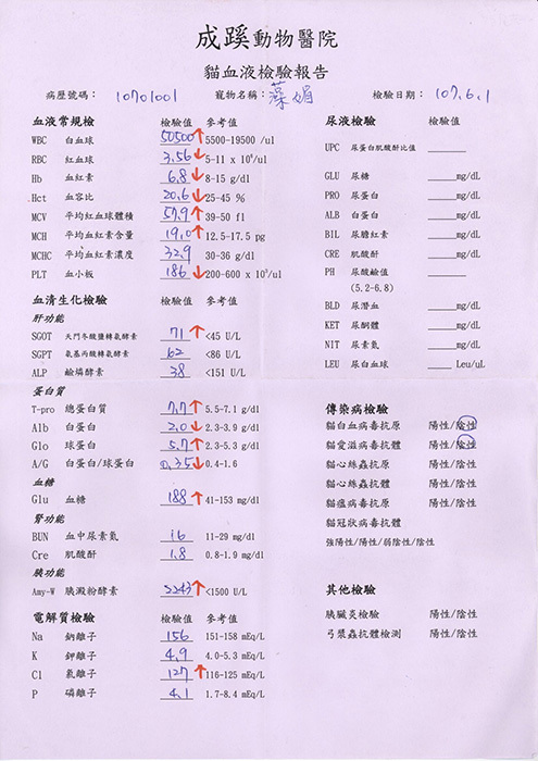 主題: 脫水,暴瘦,跳蚤咬到貧血 ,白血球指數過高的藻媚 申請者姓名: 陳盈君 花色: 申請日期: 2018-06-12 10:24:55 申請者部落格: 申請者臉書網址: https://www.facebook.com/profile.php?id=100009826632869 所在縣市/合作醫院: 新北市/成蹊動物醫院 治療費用: 4800元 需求人數: 12人 已結案 (2024-06-01 13:10:40) 報名人員: 劉熊妹(已付款)、身輕(已付款)、mini(已付款)、Evy(已付款)、EMMA(已付款)、Rou Hui Wu x2(已付款)、Julia Pan x2(已付款)、何春生 x2(已付款)、KATIEB LIN(已付款)、 候補人員: 動物病情說明: 藻媚是比較膽小的小型母貓,平常都不敢亂跑,都只在一個小範圍移動,去年還把她餵的胖嘟嘟的,今年開始發現她越來越瘦,4月底開始消失一個多月,都沒有出來討飯吃,怎麼找都找不到,消失一個月再出現已經瘦得剩下皮包骨,身上的毛髒兮兮,像是濕透又乾的感覺,帶去醫院治療。檢查沒有外傷,但是有脫水的狀況,身上跳蚤超級多,點藥之後驗血結果有貧血跟白血球指數太高的問題。 動物近況說明: 醫生診斷應為跳蚤太多導致貧血,住院後陸續打了兩針造血針&消炎針之後,食慾突飛猛進,每天在醫院吃超多,恢復狀況良好,所以住了8天就可以出院。
