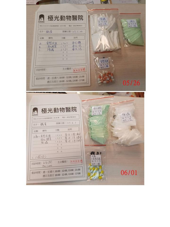 因磷指數上升,會給吃少量福斯利諾降磷藥,如果又有不好反應就再停掉;另外先前因肝指數已變好因而停掉的類固醇,這次會再給,因為鐵蛋先前吃類固醇很久,有可能身體對類固產生依賴性,停掉後就會不舒服沒食慾,因此這次嚐試再給類固醇,觀察看看鐵蛋的反應。