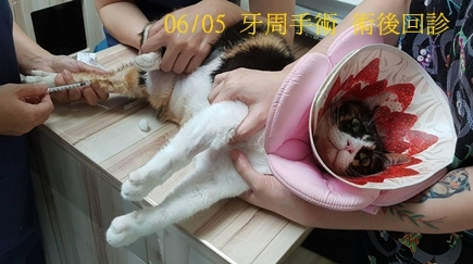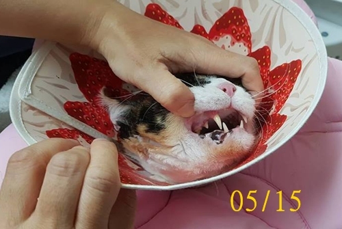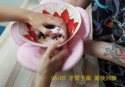 今年三月時照護人員發現她流口水看起來很不舒服,體重也有減輕,抗拒碰觸,帶她至醫院檢查,經驗血、照x光,診斷結果她的右上犬齒跟右上第三前臼齒的前齒根有發炎, 兩側上面第四前臼齒牙結石較嚴重,所以造成她口腔極度不舒服影響食慾精神,於是在5/29安排牙週手術,口腔患處進行洗牙拔牙,術後除了服藥也須再回診檢查恢復情況,醫療費用請大家幫忙。