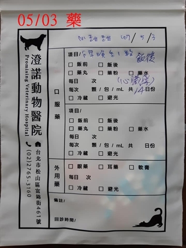 《早》《晚》各一顆心臟藥,請照藥袋標示投藥。