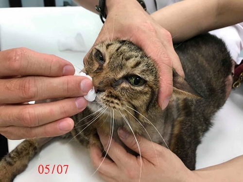 callme有很嚴重的呼吸道疾病,鼻腔分泌物很多,每天都會流出黃綠色鼻膿,鼻膿乾涸就阻塞鼻孔,X光影像可見肺部內支氣管的部分呈現白濁,感染發炎的範圍不小,呼吸時都有呼吸道雜音,鼻涕還出現血絲,淚腺被阻塞,經常淚眼汪汪。