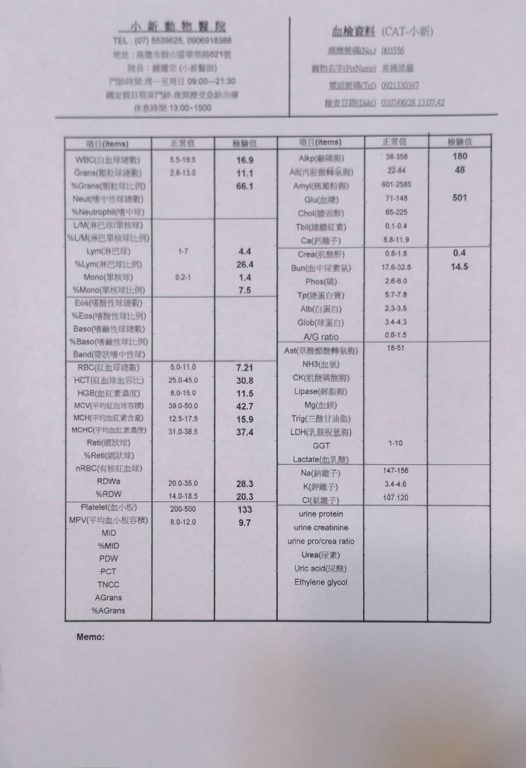 主題: 車禍黑貓 申請者姓名: 張菱予 花色: 申請日期: 2018-07-26 11:35:18 申請者部落格: 申請者臉書網址: http://www.facebook.com/clyanal 所在縣市/合作醫院: 高雄市/小新動物醫院 治療費用: 12150元 需求人數: 26人 已結案 (2024-06-01 13:09:58) 報名人員: 珊珊(已付款)、郁婷(已付款)、lin789 x14(已付款)、Fenny x10(已付款)、 候補人員: 動物病情說明: 晚上十點半在國道十號匝道口看到小黑趴在路中央不能動彈,高速公路上的車在小黑咫尺處疾駛而過,情況非常緊急,暫停路邊等待時機衝上前去把滿臉是血的他帶離路面!仔細查看發現小黑眼睛鼻子有出血狀況,四肢有反應但無力,僅能微微晃動,研判受到不小的撞擊!儘速送往小新動物醫院,醫生做初步觸診時小黑並無太大反應,雙眼緊閉,但是仍有意識、心跳,但有失溫狀況,趕緊給予保溫和輸液治療,先把生命跡象穩定下來再進行後續治療! 動物近況說明: 小黑到院後先穩定生命跡象,輸液治療並使用降腦壓藥物治療腦傷。接著照X光檢視是否有骨折,所幸小黑骨頭並未受到傷害。治療初期小黑並無法正常行動,僅能將頭微微抬起進食,但持續給藥輸液治療兩週後能正常行走,研判已無生命危險,故接出院自行中途照護。在此感謝各位捐款人,讓求生意志強烈的小黑能夠得到良好的醫療照顧!