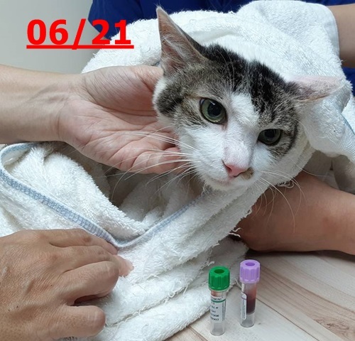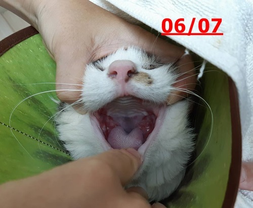 苗栗照護員某日發現冠冠食慾變差也變瘦,經回報協會,立即安排將他帶回台北協會配合的醫院檢查,檢查結果是冠冠有很嚴重的口炎,血檢結果顯示也有腎衰情況,因此在5/10住院進行拔全齒手術,手術完成後,腎衰及口炎的部份都須要都長期服藥治療及定期檢查,於是冠冠便住在台北的安養之家,以便定期回診檢查。
