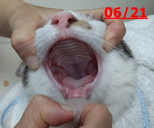 動物近況說明: 冠冠在牙週手術後及按時服藥的情況下,口炎的問題已改善進步不少,食慾也因此變得好很多了,醫師已逐漸減少類固醇使用量並可延長時間回診。