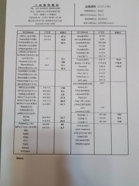 主題: 嚴重腎衰+脫水黃疸及口腔潰爛的明太子 申請者姓名: 周佳旻 花色: 申請日期: 2018-07-19 22:33:31 申請者部落格: 申請者臉書網址: chiachia1981@gmail.com 所在縣市/合作醫院: 高雄市/小新動物醫院 治療費用: 6500元 需求人數: 15人 已結案 (2024-06-01 13:09:30) 報名人員: Pallina(已付款)、lin789 x14(已付款)、 候補人員: 動物病情說明: 高雄已經下超過一個星期的大雨了,外面的孩子們都無法好好出席吃飯,每天都是三三兩兩的,不是少那隻就是少這隻的,好不容易終於有段時間雨停了,趕快衝去放飯,孩子幾乎都有出來,但還是少了那一兩隻,心想敲一下罐頭沿路找找說不定叫得出來,敲著敲著走著走著,咦!在愛玉冰攤子下面有一隻,奇怪怎麼不出來,不太動耶,是怎樣?走近一看,明太子!!消失三個多月的明太子!他還在耶!餵食地點是個傳統市場,貓孩來來去去的,其實很習慣了,當孩子消失了超過一星期,我都會當他不在了,所以明太子的出現絕對不是來報恩的,他一定是病了,趕快衝回家拿提籠,明太子居然病到我用手就可以抓到放進籠子裡,可見他真的很嚴重,全身只剩骨頭,呼吸很微弱,別想了,趕快送醫要緊。 動物近況說明: 送醫的當天晚上,醫生就有說明太子的狀況不是很樂觀,明太子在撐了一個星期之後還是離開了,很遺憾,但還是很謝謝醫生和助理們的幫忙照顧,明太子的醫療費用還懇請大家多多幫忙,謝謝!