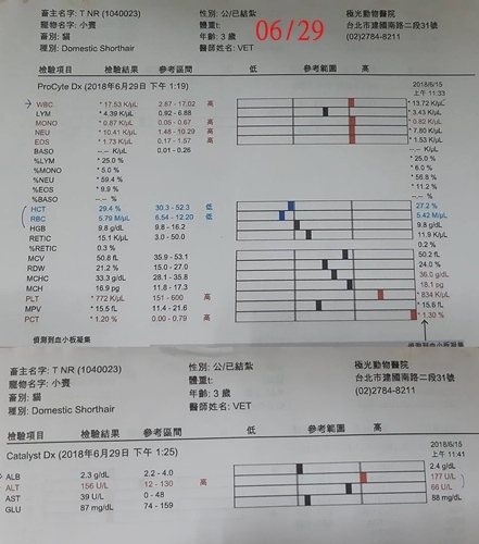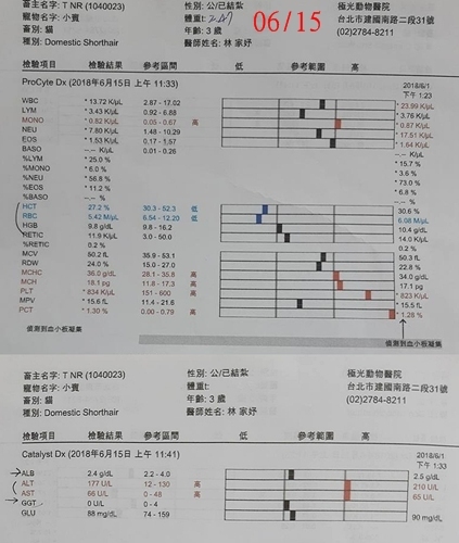 血檢結果,今天多驗了一個對貓咪肝臟反應更敏感的指數GGT,驗出指數是OK的,所以看來小賓的肝臟指數目前大概就維持在這樣了;紅血球與白蛋白有掉一些,這兩樣指數跟消化道有關,看照護記錄小賓有水便情況,這應該就是指數掉的原因。