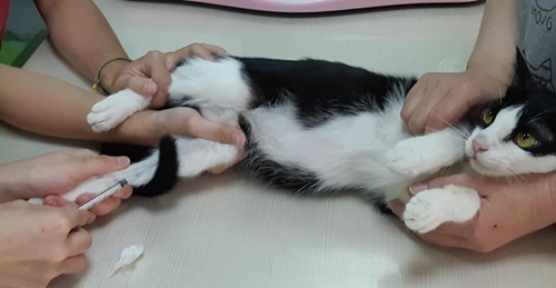 剛住進協會安養之家時,小賓不管吃什麼都是又吐又拉,身形極瘦,毛也稀疏無光澤,協會工作人員努力搜尋資料為他準備適合的食物,並需要經常回診檢查健康狀況的變化。