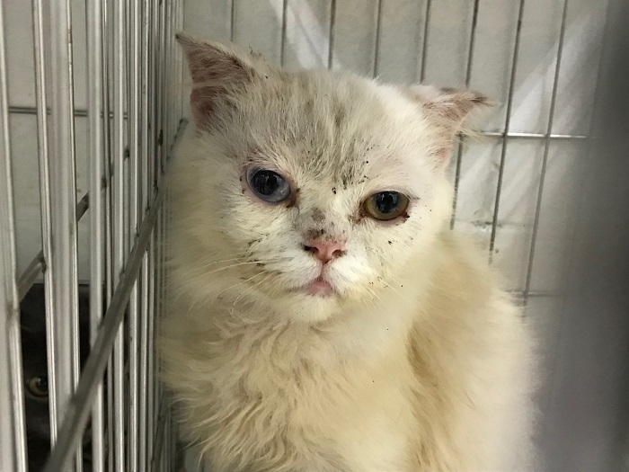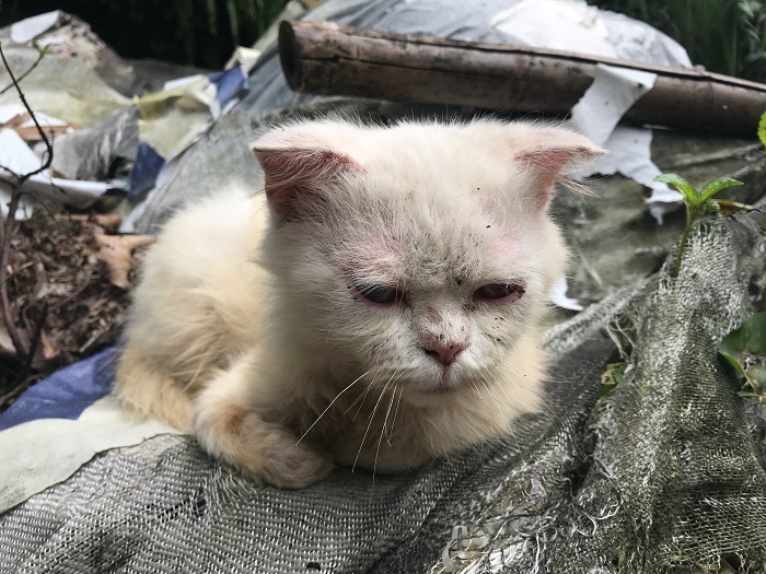 發現隻蜷縮在廢棄垃圾堆中的白色折耳波斯,