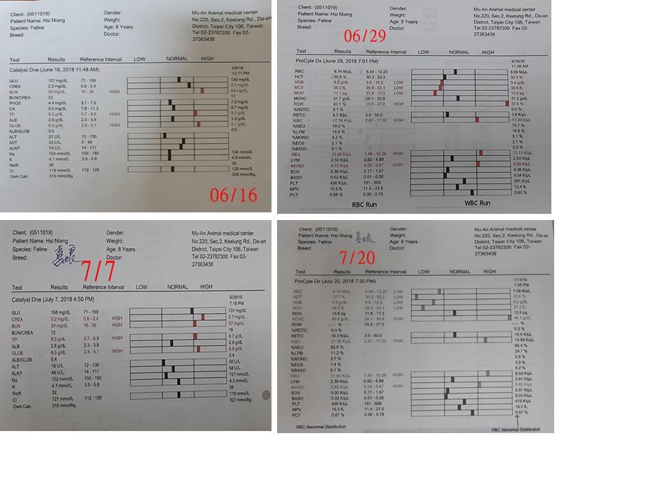 血檢結果,腎指數crea2.2(上次3.7,正常值0.8-2.4)、bun52(上次64,正常值16-36),磷也有降下來,這對喜娘來說是很好的進步。