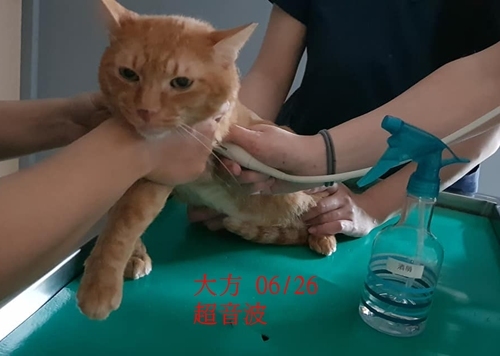 今年5月時照護員發現大方精神不佳,完全無食慾,都沒有上廁所,於是在5/15晚將他帶回台北臨時約診,檢查結果他的體重從4月初的5.04 kg下降到4.40kg,白血球三萬多,照X光檢查,排除異物阻塞的可能,但有看到心包膜有些微積水狀況,並於膀胱上發現有一白點,但做超音波時並未看到結石等異物,