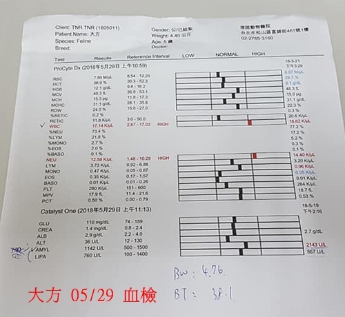 大方5/15的血檢白血球(WBC)高達37.81,5/21下降到18.62出院,今日數值為17.14,另上次驗出有胰臟炎,今日的胰臟相關血檢AMYL,也已從上次的2143下降到標準值內,顯示有獲得控制。