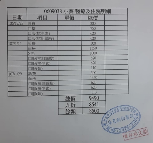 2017年12月時因小葵呼吸聲很大,帶她至醫院看診,拍胸腔x光片發現肺部有輕微發炎,除了需要服用藥物,還要每天做兩次的氣霧治療,並持續回診檢查治療情況,請大家幫忙小葵的醫療費用。