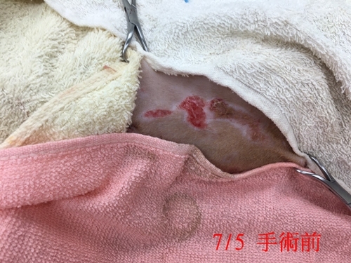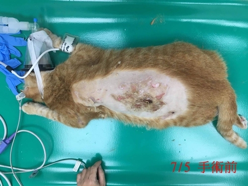 因為考慮傷口位置,及皮膚張力,可以直接進行手術切除(預計07/05進行),故無將痂皮撕開清創.減少貓咪的疼痛.