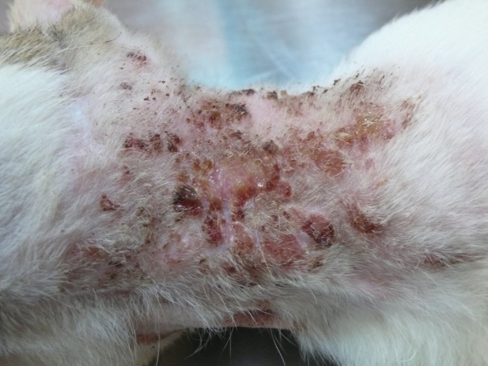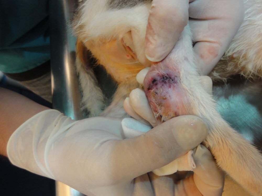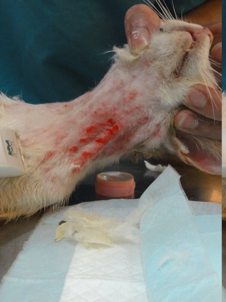 這貓經檢查後,脖子的傷口,是溼疹造成,後腿另有咬傷,也一並治療,並且結紮、剪耳。