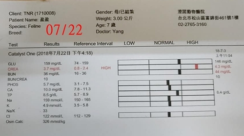 血檢結果,盈盈的腎指數Crea3.7(上次4.3), Bun36(上次44),都有降低,且BUN回到正常範圍內,表示皮下注射有產生效果。