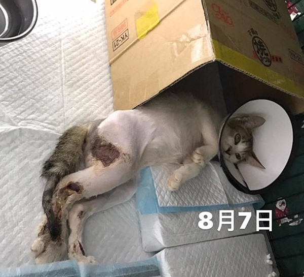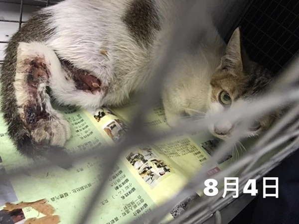小綠是第20隻抓到疑似灼燙傷的小貓,是8月4日民眾通報受傷待救援貓咪。