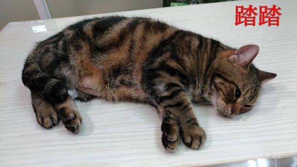 踏踏是在2014年志工去到五股收容所時,看到她隔著籠子不停的磨蹭,很撒嬌的對著志工喵喵叫,經志工詢問所方人員,得知踏踏是因為癲癇而遭到主人棄養,志工於心不忍,便將她接出送醫院治療。