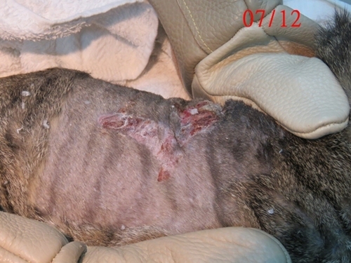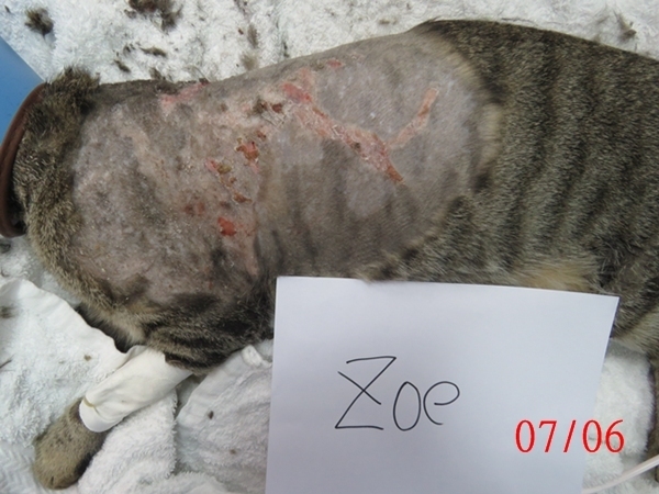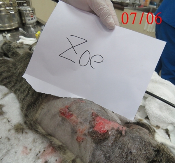 Zoe是隻可愛漂亮的虎斑母貓,在敦化公園附近生活多年,一直親人乖巧,不幸也遭變態盯上,背部側腹被潑灑化學液體造成大片潰爛傷口,協會在7月6日誘捕到她送至愛屋動物醫院,醫師研判她應在6月初時受傷的,且依傷口外觀,醫師認為是熱源或是腐蝕性液體造成的,想到她拖著這樣的傷口不知有多痛的忍著這麼多天,令人對該死的變態垃圾虐貓犯更加深惡痛絕,能對無辜的親人街貓下此殘忍的毒手,真是十足的心理變態,應受到眾人的唾棄不齒,人人都須提防這樣的社會敗類。