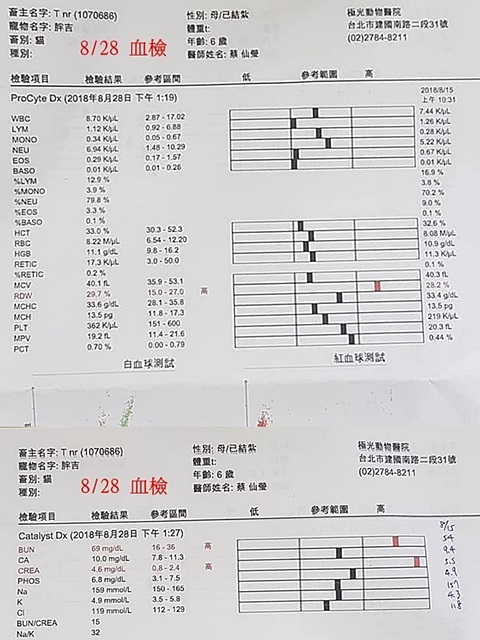 今日有血檢,數值皆正常,腎指數Crea下降(5.5/4.6),Bun(54/69)上升,醫生認為可能是攝取蛋白質較多,另磷數值上升(4.9/6.8),醫生希望磷結合劑(樂寵)能讓胖吉確實吃下去,再請照護員討論有甚麼方法可以達成。