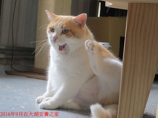 2016年6月間奶油獅遷居至大湖安養之家,開始也是一直躲藏,經過一段時間適應後過得很怡然自得,長得越來越圓,非常可愛漂亮。