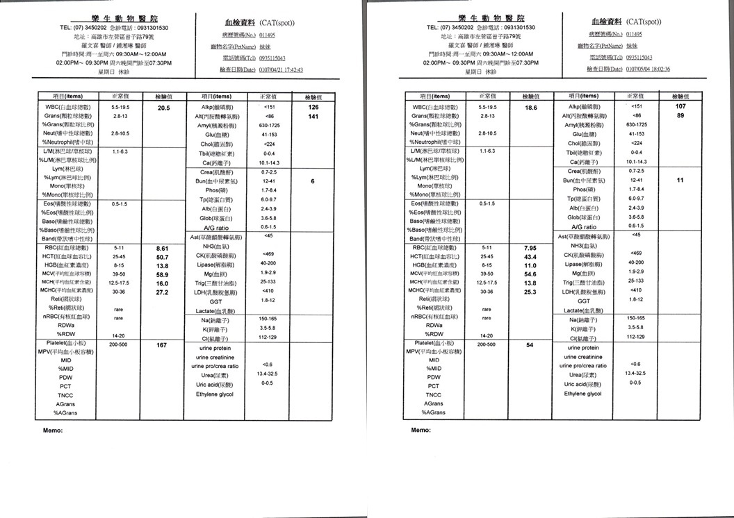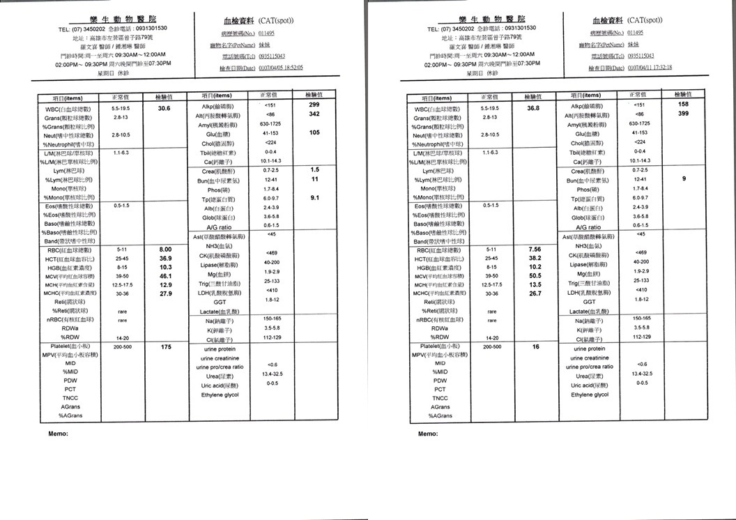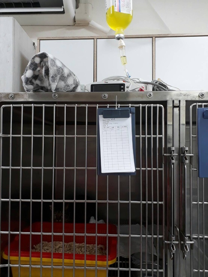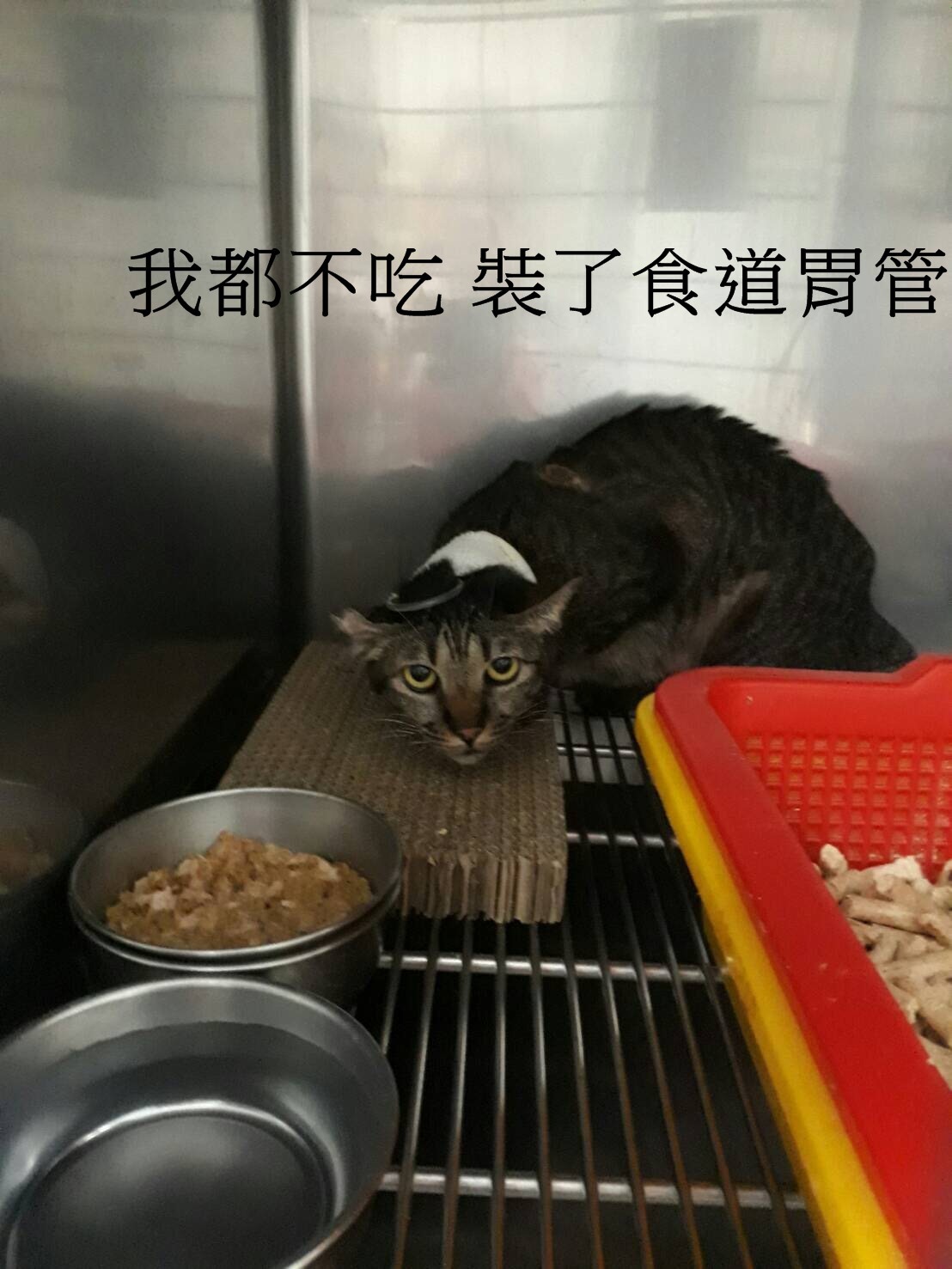 住院期間因膽肝炎及脂肪肝造成食慾廢絕有裝食道胃管做灌食,直至5/8友開始進食後拆管,直至5/18狀況都已穩定,沒有再嘔吐且食慾狀況都恢復正常後才出院