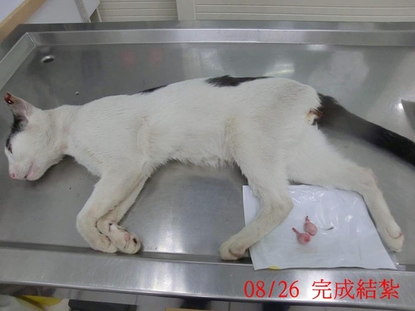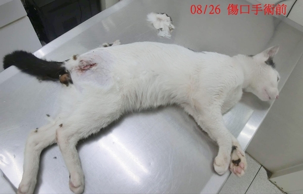 8月26日醫師為黑白公貓咪進行檢查,全套血檢、二合一檢查、x光檢查,傷口一個洞蠻深的已潰爛,血檢顯示可能因疼痛引起血糖升高及有發炎現象,二合一檢驗為陰性,隨後進行手術清創縫合傷口、並同時完成結紮,術後讓貓咪留院以觀察傷口恢復情況及休養。