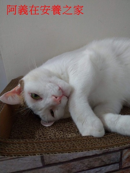 照護員依照醫囑,每天幫阿義點眼藥水、餵吃離胺酸保健品,淚眼情況已有改善,阿義個性很乖巧,但出門看醫生會讓他緊張沿路喵喵大叫個沒停過,讓人覺得好笑又心疼,希望阿義一直健康平安,這樣就不用出門看醫生讓他怕怕了。