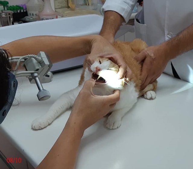 今年4月間工作人員發現管管吃飯時發出疼痛叫聲,嘴角並有黑色唾液痕跡安排就醫,發現有嚴重的口炎,上顎臼齒的牙齦很紅腫,其它部份也有牙齦炎,5/8進行牙周手術拔牙,先將發炎較嚴重的牙齒拔除,術後仍持續回診追蹤。