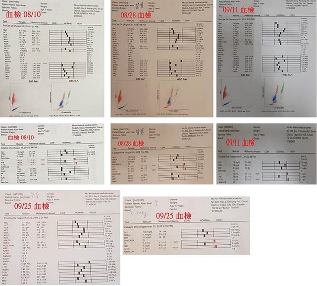 血檢報告,肝、腎、紅白血球都沒問題,唯有發炎指數比拔牙後高,前次牙周手術時有洗牙將牙齒清乾淨,經過一段時間細菌又滋生因而再度發炎,牙齦發炎處還是很紅腫,這樣看來拔牙對管管的口炎並沒有太大的幫助,因此用藥方面要停吃抗生素、將類固醇的劑量提高,服藥兩週後再看效果。