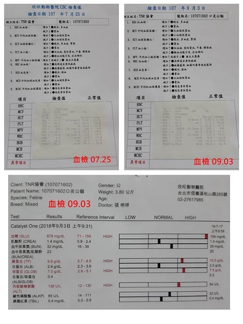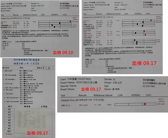另為治療貓咪口腔瘜肉,8/29至沐恩醫院檢查時發現血糖指數極高,因此再回到欣旺醫院開始施打胰島素治療,監控血糖指數變化,至10/4日血糖指數正常後至沐恩醫院進行熄肉切除,術後再至欣旺醫院接受照護觀察,於10/14日狀況穩定後辦理出院。