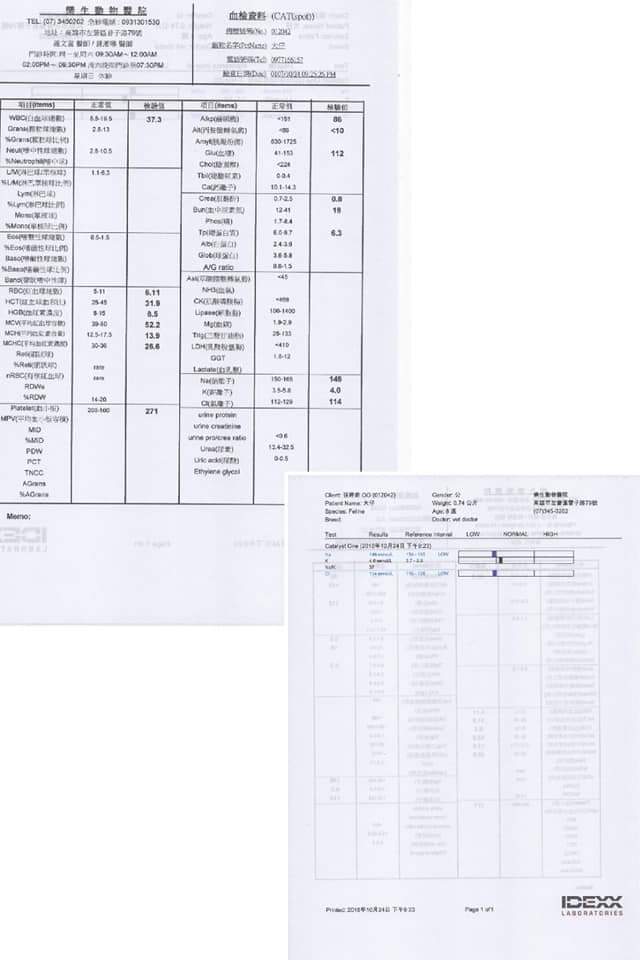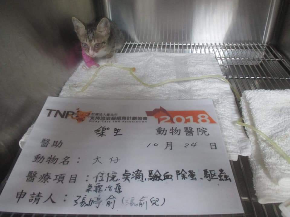 主題: 同胎小貓2眼鼻氣管炎非常嚴重的大仔 申請者姓名: 張俞兒 花色: 申請日期: 2018-11-14 07:31:29 申請者部落格: 申請者臉書網址: sammiping2011@yahoo.com.tw 所在縣市/合作醫院: 高雄市/樂生動物醫院 治療費用: 8000元 需求人數: 30人 已結案 (2024-05-31 18:39:41) 報名人員: 查理(已付款)、Kaoru Lin x2(已付款)、安靜的媽(已付款)、Tammy Lai(已付款)、尤(已付款)、Holly x2(已付款)、CHC(已付款)、張淑珍(已付款)、Jayh、Emily x2(已付款)、M(已付款)、王俊發(已付款)、vivian x2(已付款)、shawn28(已付款)、Kate(已付款)、方子瑀(已付款)、施(已付款)、張瑞芬 x9(已付款)、정세라(已付款)、 候補人員: 動物病情說明: 同胎小貓是我餵養區附近的浪貓生的小貓,前天經過無意中看到1隻小貓(仔仔)雙眼眼睛流血鼻氣管炎嚴重,沒想到昨天又看到同胎的另一隻小貓(大仔)雙眼也是鼻氣管炎嚴重,只好耗時間抓到送醫,醫生檢查後,大仔有鼻氣管炎的症狀及嚴重的結膜炎,初步驗血有白血球過高及電解質偏低的現象,目前已先點滴輸液給藥治療,稍有吃,但吃不多,狀況比昨日來的貓(仔仔)好一點。