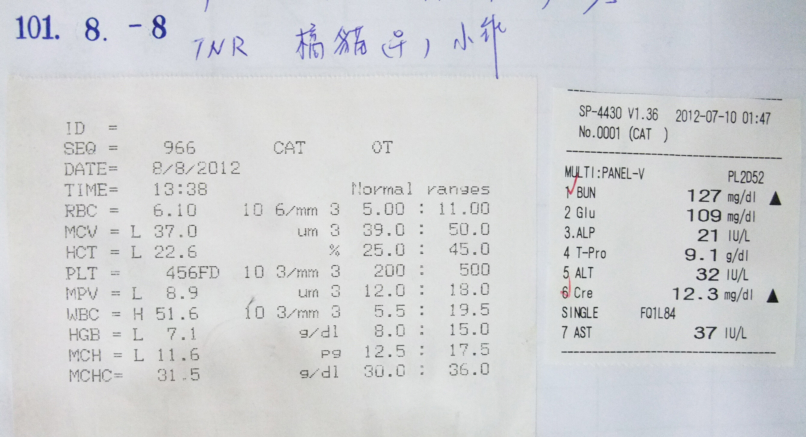 主題: 腎衰竭末期的乖乖貓 申請者姓名: 鍾乙玄 花色: 申請日期: 2012-08-31 09:26:03 申請者部落格: 申請者臉書網址: http://www.facebook.com/ihsuanchung 所在縣市/合作醫院: 高雄市/新德民動物醫院 治療費用: 9400元 需求人數: 11人 已結案 (2012-12-08 19:12:53) 報名人員: 徐小冠(已付款)、May Ho(已付款)、版畫(已付款)、郭小寶(已付款)、Yen-Yuan Wang(已付款)、philip(已付款)、Sophie Chang(已付款)、Moon Wu(已付款)、Welltea Wu(已付款)、李婕瑜(已付款)、Abby Yu(已付款)、 候補人員: 小舟、小舟、 動物病情說明: 這隻是我誘補進來要TNR的貓,在這次誘補她進來的1個月前,我才連續誘補她失敗2次,那時就奇怪的發現,無論是罐頭或飼料,這隻貓對任何吃的東西似乎不太感興趣。