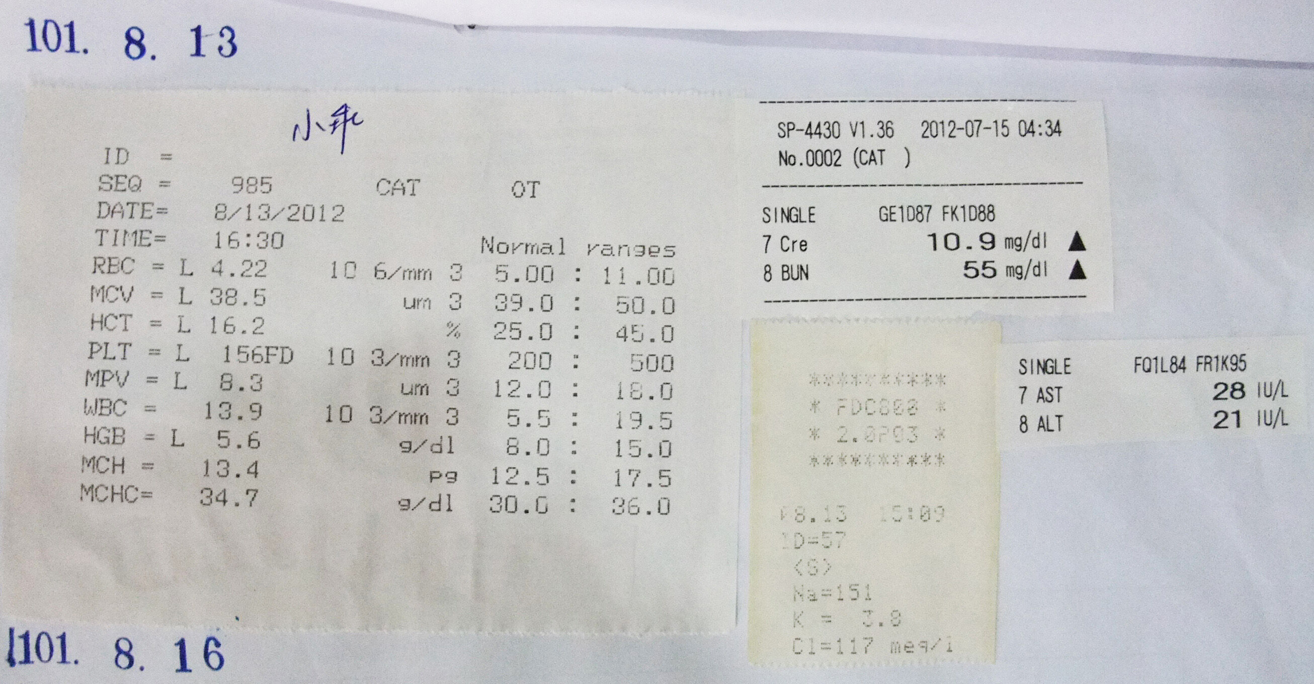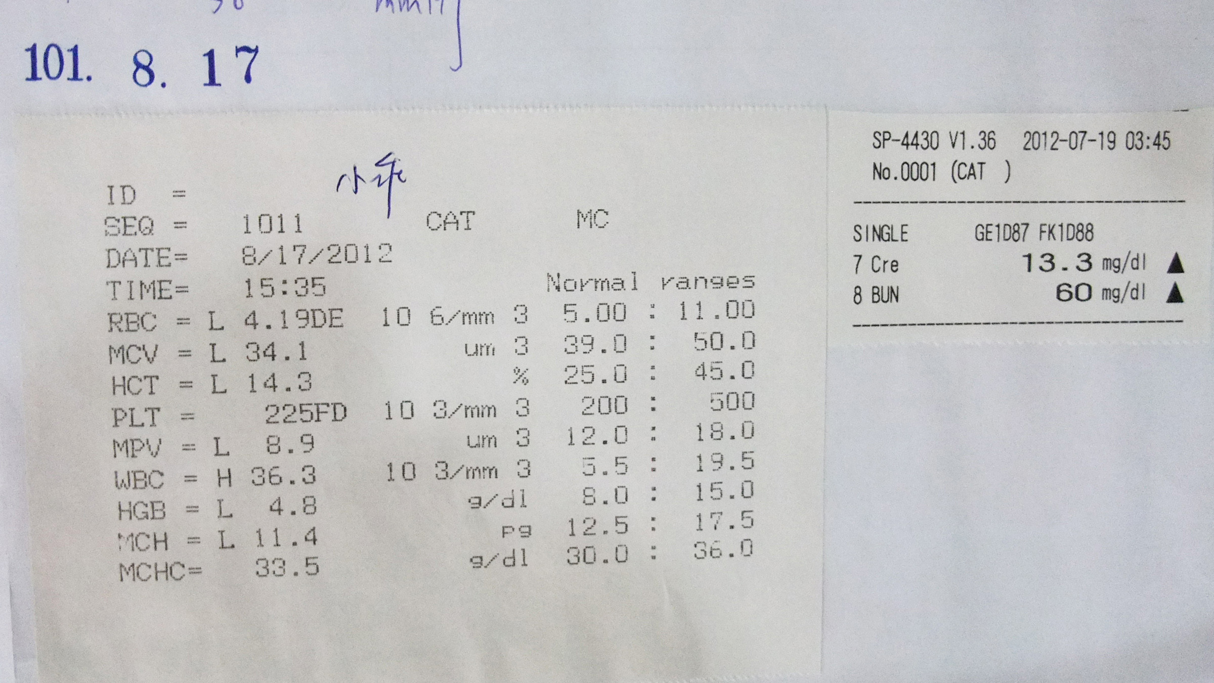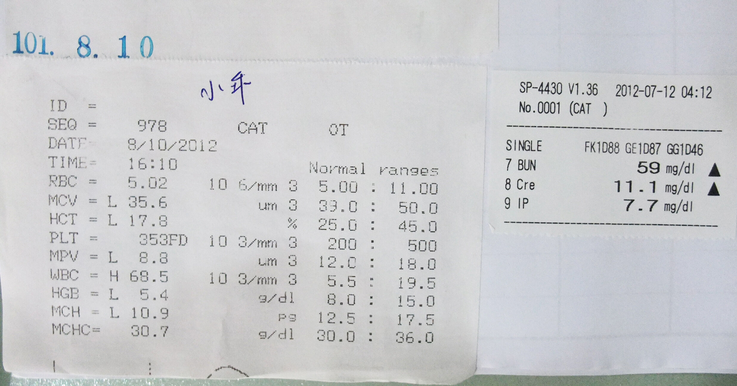 幾天後,腎指數有稍微的下降,但還是高的驚人,所以醫生拍了X光確認,我們看到,一顆腎臟已萎縮,一顆則異常的腫大。醫生說,因萎縮的腎臟已失去功能,所以造成另一顆腎臟過度使用,但不代表它的運作功能是正常的。