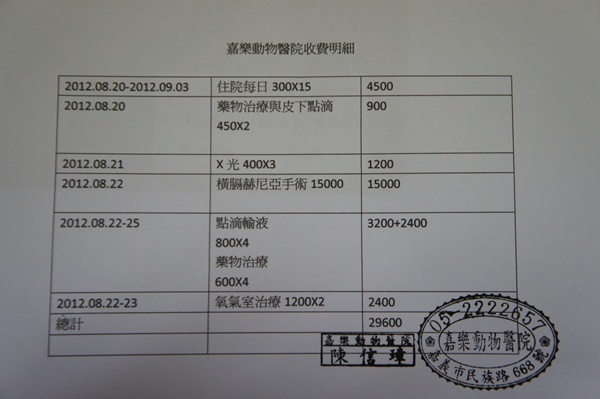 主題: 嘉義僅700g二個月大車禍小貓Jagabee橫隔膜手術 申請者姓名: 黃詩宇 花色: 申請日期: 2012-09-04 13:40:00 申請者部落格: 申請者臉書網址: https://www.facebook.com/media/set/?set=a.458485834183744.106861.100000669958337&type=1 所在縣市/合作醫院: 嘉義市/嘉樂動物醫院 治療費用: 29600元 需求人數: 31人 已結案 (2012-12-08 18:48:23) 報名人員: 王玉珊(已付款)、Shizuka Ho(已付款)、Nico Lin(已付款)、Chen Yu Lin(已付款)、白婷(已付款)、高凱(已付款)、meemee(已付款)、陳小靜(已付款)、nicole chen(已付款)、張又懿(已付款)、Mia Yu(已付款)、郭小蓉(已付款)、Alumi Lu(已付款)、WeiLin Chen(已付款)、mitdo43(已付款)、巧蓁(已付款)、sanko(已付款)、Yu-Chen Lee(已付款)、yushi0304(已付款)、丫伯(已付款)、小宇(已付款)、曾國忠(已付款)、bombora(已付款)、林咖咖(已付款)、蔣怡文以四面佛名義迴向流浪貓(已付款)、novia(已付款)、Chia-lin Li(已付款)、chiawei(已付款)、Shan Chou(已付款)、uiii1225(已付款)、杜杜(已付款)、 候補人員: 小舟、小舟、 動物病情說明: 8/23