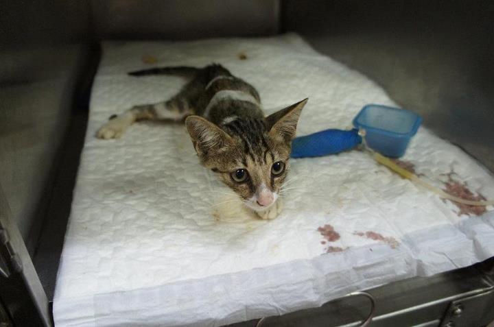這是前晚跟mindy求援的嘉義車禍小貓,後來轉由與南部志工宋's聯繫,原本是昨日下午要南下高雄醫治,後來因宋's詢問多位醫生意見,認為風險非常大、且貓咪不適合長途奔波,建議先找嘉大評估,但我昨天下午去接貓咪時,因貓咪狀況不佳,已無法進食,故臨時決定在原本的嘉樂動物醫院開刀。