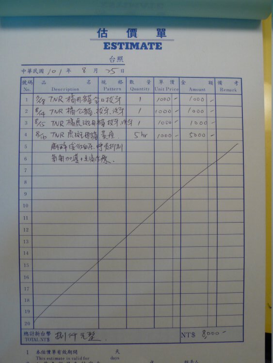 主題: TNR遇到需拔牙、黃膽等傷病貓4隻額外醫療費用 申請者姓名: Akimasa Tu 花色: 申請日期: 2012-09-05 10:29:05 申請者部落格: 申請者臉書網址: https://www.facebook.com/akimasa.tu 所在縣市/合作醫院: 台北市/長沁動物醫院 治療費用: 8000元 需求人數: 19人 已結案 (2012-12-08 18:46:33) 報名人員: Wang Hsiao-yun(已付款)、呆呆(已付款)、蔣怡文以四面佛名義迴向流浪貓(已付款)、Nikki(已付款)、Ch Huang(已付款)、科莫多黑熊林(已付款)、OLivia Lee(已付款)、OLivia Lee(已付款)、Ling-yu Yeh(已付款)、Freya(已付款)、Yolanda A Mo(已付款)、張晴雯(已付款)、Candace Peng(已付款)、TRACY(已付款)、Tia Hong(已付款)、boodan(已付款)、Huimin Liu(已付款)、Sally Shih(已付款)、龍豪(已付款)、 候補人員: 小舟、小舟、 動物病情說明: TNR遇到一些有病痛的貓,會利用結紮時,順便處理,流浪貓常見的,就是牙齒問題,牙結石、蛀牙等,都影響到浪貓的進食,若有遇到這種情況,會適當的拔牙,有三隻貓額外拔牙,一隻是在協會後方抓的母貓,另二隻則是童小姐誘捕的貓。