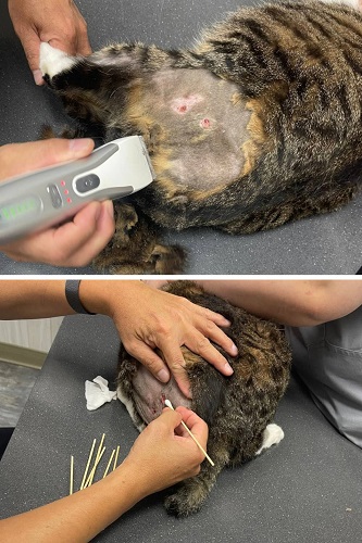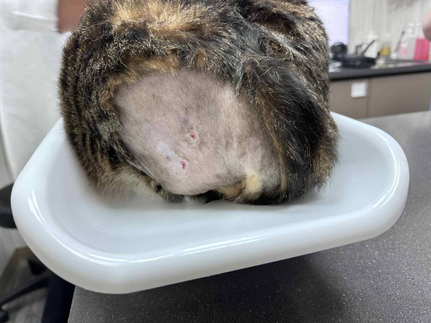 達洋在2024年9月間出現兩耳朵耳背泛紅還腫起來,至沐恩醫院檢查,血檢無異常、淋巴沒有腫大、口腔情況正常,而除了耳背紅腫,耳內及頸部、下巴、肚皮、尾巴都有皮膚患處,研判可能是過敏引起,醫師將患處剃毛刷洗,打類固醇針劑及吃抗組織胺及抗生素,醫囑要戴頭套避免發癢舔抓,用藥後一度有好轉、即將可以停藥時,在2025年1月間又再度復發,除了患處多也有很多皮屑,醫師採樣以玻片查看有看到疑似黴菌孢子,開始吃黴菌藥及其他用藥做調整,照護員每天刷洗患處,也要一個月回診一次,血檢結果都沒有因為吃藥受到影響,但皮膚患處狀況沒有改善很多,醫師增開止癢口服藥,2025年2月24日再回診,血檢仍正常,但皮膚仍不夠好所以再吃抗生素。