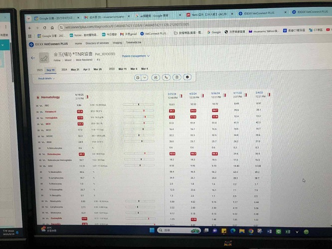 於2025年9月金玉開始連續多日嘔吐精神稍差於是安排2025年9月19回診,血檢後發現紅血球逐漸變大需加吃葉酸補充並持續觀察。本筆醫助是2025年9月19日於沐恩醫院治療的費用,包含血檢及用藥。