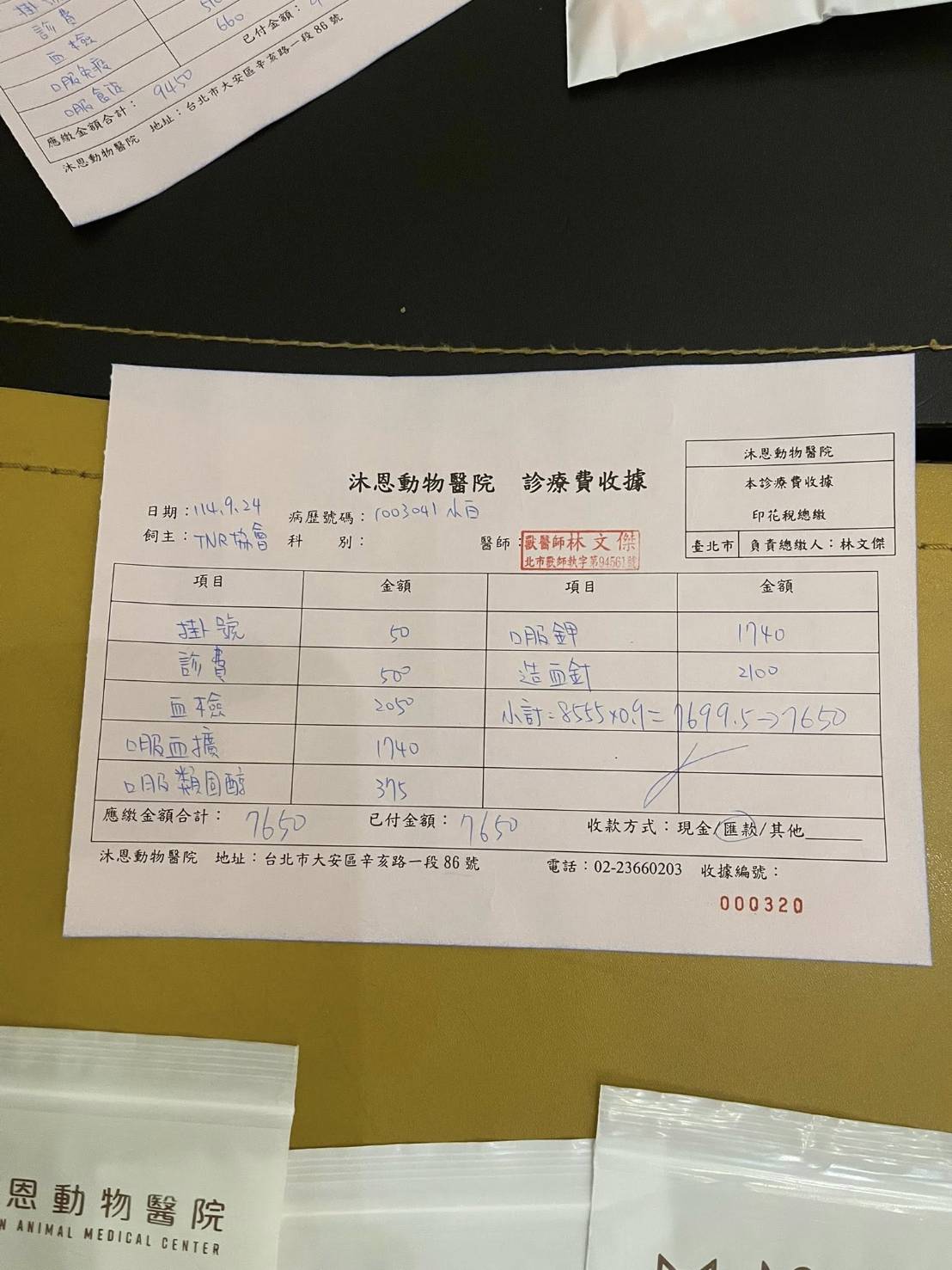 主題: 治療腎功能衰退的小白及9月處方飼料添購 申請者姓名: TNR協會 花色: 白色 申請日期: 2025-10-02 13:30:59 申請者部落格: 申請者臉書網址: 所在縣市/合作醫院: 台北市/沐恩動物醫院 治療費用: 13800元 需求名額: 46人 平均每單位: 300元 已報名名額: 46 尚需求名額: 0 報名人員: 1.Claire Huang (已付款)