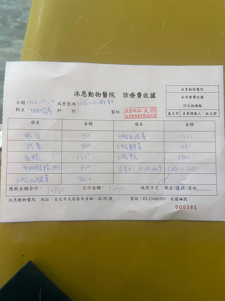 本筆醫助是2025年10月14日間於沐恩醫院的費用,包含血檢、甲狀腺檢測及用藥。