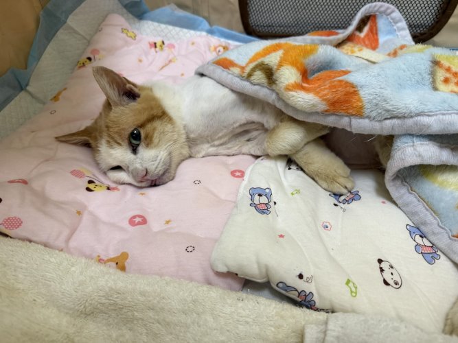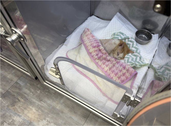 保溫:住院期間四肢蓋毛巾體溫可以維持在38.5度左右,回協會可以視情況增加暖燈斜及暖包。(須注意暖燈不可直視眼睛!暖包小心燙傷!)