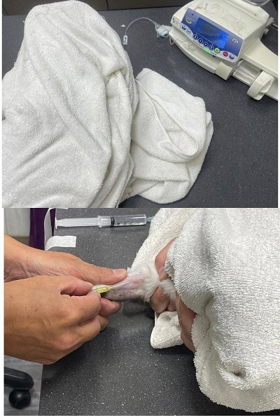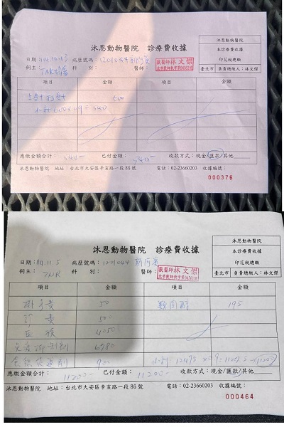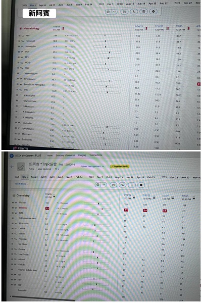 2023年8月間的回診因血檢腎指數升高開始打皮下輸液,還好兩週後回診指數有降下來,但為避免變化,還是需要持續打;2024年10月間為讓新阿賓的健康能更為穩定,開始給予胜肽治療,隨著病情改善也可逐漸延長回診時間。