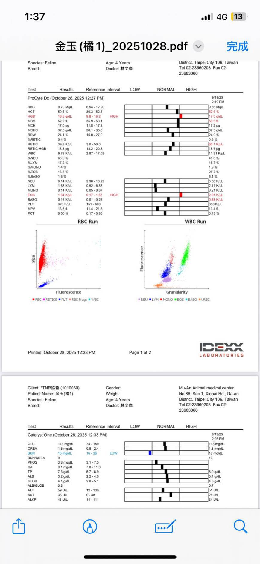 金玉是很漂亮的橘子男生,個性活潑又親人,本筆醫助是金玉自2024年7月7日至2025年10月28日間,分別於沐恩醫院看診包含血檢及用藥。