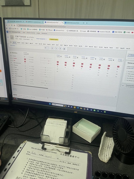 2017年間旺寶因心雜音大、心臟尺寸較大,至心臟專科專心醫院檢查,除了二尖瓣膜有逆流情形,心臟本身並無異常,並不需要吃心臟藥,後來在2023年9月22日間因血尿至沐恩醫院檢查、吃藥兩週後於2023年10月24日回診發現腎指數升高很多,原本懷疑是與膀胱發炎影響,開始每天打皮下輸液,但腎指數雖有改善但還是不穩定,2024年4月間回診抽血檢驗時出現血液不好抽出的情況,加上之前有心臟較大的問題,雖血壓測量數值並無異常但擔心可能血液循環不好,所以開始增加吃血擴藥,之後仍持續至沐恩醫院的回診追蹤腎指數及血壓,一年多來,腎指數雖然仍在偏高情況但也沒有特別異常的上升。