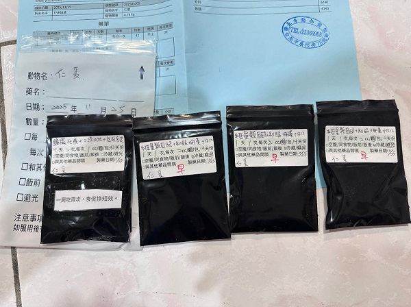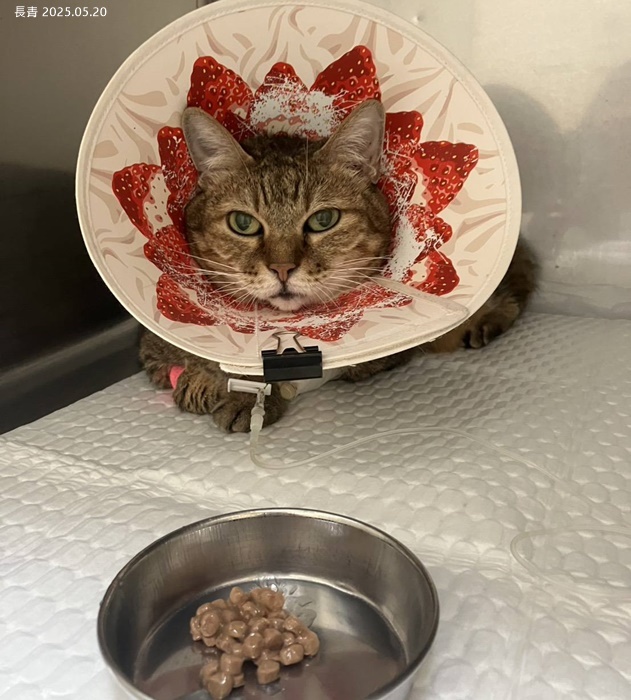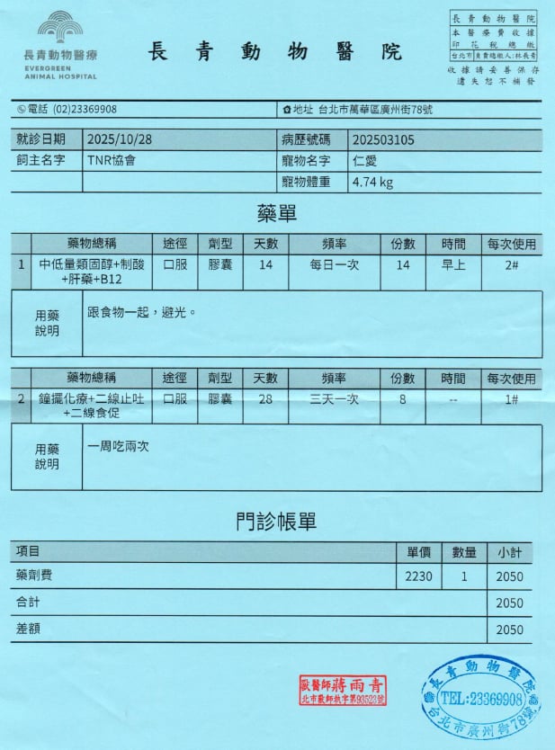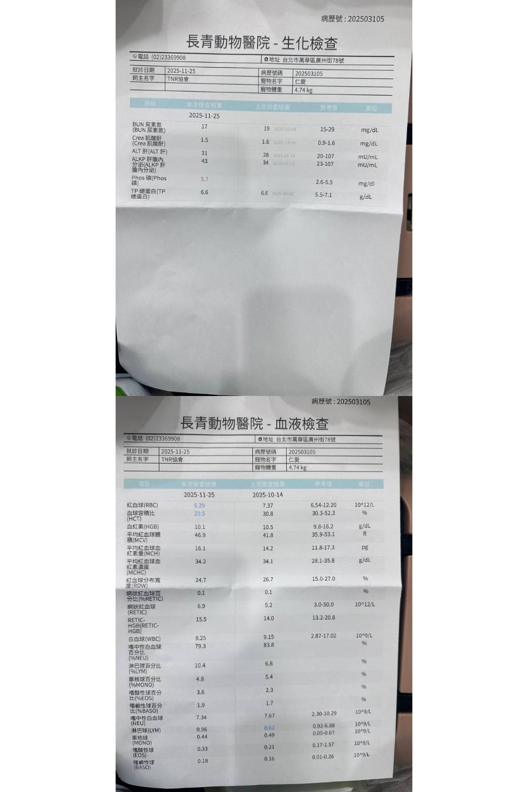 2025年11月25日回診,此次體重增加突然變胖太多,醫師擔心有糖尿病徵兆,但上回有驗過果糖胺是正常,所以這次沒有驗,下次回診如果體重上升會再評估加驗。有與醫師討論,仁愛這幾週食慾並沒有特別變很好,但還是會自己主動吃,因此建議先從照護員灌食飼料泥減量開始。有稍微貧血但還不需要打造血針先吃倍補血保養。淋巴結有稍微變大,但在預期範圍。黴菌患處也好很多。