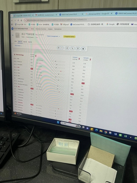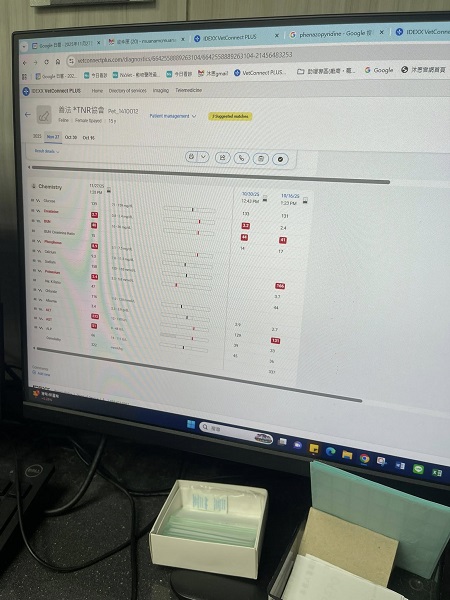 近期因善法有腹瀉狀況而於2025年11月27回診,血檢狀況看來除了肝腎指數略高,其他沒有太大問題,因此先開立止瀉藥治療。