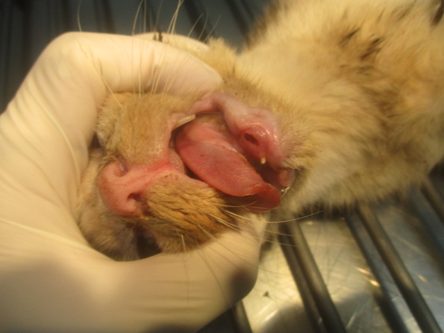 仔細查看,她的下巴向右歪斜,摸起來有一團硬塊,打開她的嘴巴發現她牙齒已掉光,只剩上下各一顆犬牙,下犬牙抵住舌頭,牙尖划破舌頭,為免舌頭被牙尖刺穿,請醫生將下犬牙拔掉,並請醫生檢查右邊舌下潰爛的部位是口炎或腫瘤