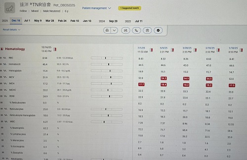 2024年9月間出現兩耳朵耳背泛紅還腫起來,至沐恩醫院檢查,血檢無異常、淋巴沒有腫大、口腔情況正常,而除了耳背紅腫,耳內及頸部、下巴、肚皮、尾巴都有皮膚患處,研判可能是過敏引起,醫師將患處剃毛刷洗,打類固醇針劑及吃抗組織胺及抗生素,醫囑要戴頭套避免發癢舔抓,用藥後一度有好轉、即將可以停藥時,在2025年1月間又再度復發,除了患處多也有很多皮屑,醫師採樣以玻片查看有看到疑似黴菌孢子,開始吃黴菌藥及其他用藥做調整,照護員每天刷洗患處,也要一個月回診一次,血檢結果都沒有因為吃藥受到影響,但皮膚患處狀況沒有改善很多,醫師增開止癢口服藥,2025年2月24日再回診,血檢正常但皮膚仍不夠好所以再吃抗生素。