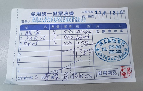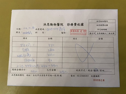 2025年12月16日回診,狀況都很好,皮膚患處也已痊癒,只需半年回診一次即固定取藥即可。目前達洋的皮膚好很多,但為以防會舔舐皮膚及抓傷還是需要戴頭套,不過達洋看起來開心很多,食慾精神也很好。本筆醫助是2025年12月16日於沐恩看診及用藥的費用。